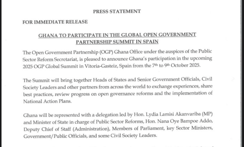 The Open Government Partnership (OGP) Ghana Office, under the auspices of the Public Sector Reform Secretariat, has announced Ghana’s participation in the forthcoming 2025 OGP Global Summit to be held in Vitoria-Gasteiz, Spain, from 7th to 9th October 2025.