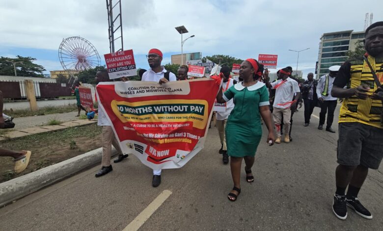 The Coalition of Unpaid Nurses and Midwives on Thursday, October 2, staged a protest in Accra to demand the payment of salaries for nearly 7,000 health workers who have been working without pay for close to 10 months.