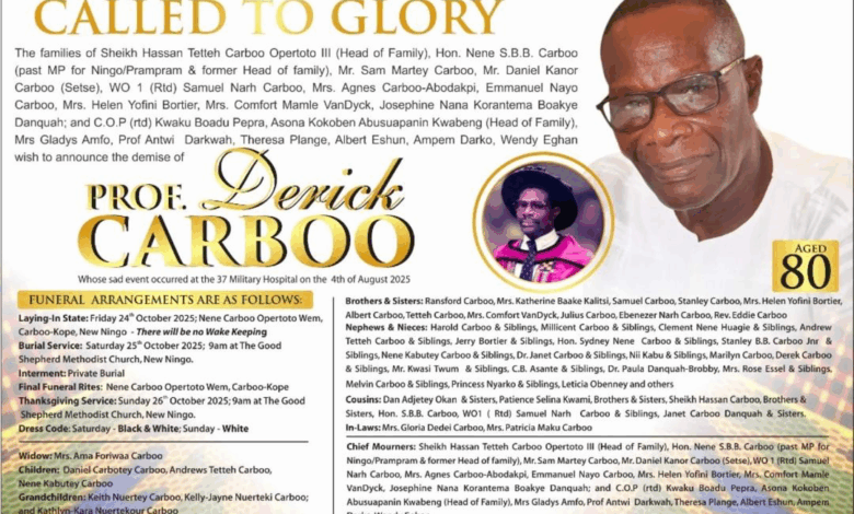 The families of Sheikh Hassan Tetteh Carboo Opertoto III (Head of Family), Hon. Nene S.B.B. Carboo (Past MP for Ningo/Prampram & former Head of family). Mr Sam Martey Carboo, Mr Daniel Kanor Carboo (Setse), WO 1 (Rtd) Samuel Narh Carboo, Mrs Agnes Carboo-Abodakpi, Emmanuel Nayo Carboo, Mrs Helen Yofini Botier, Mrs Comfort Mamle VanDyck, Josephine Nana Korantema Boakye Danquah and C.O.P. (Rtd) Kwaku Boadu Peprah, Asona Kokoben Abusuapanyin Kwabeng (Head of family), Mrs Gladys Amfo, Prof. Antwi Darkwah, Theresa Plange, Albert Eshun, Ampem Darko, Wendy Eghan, wish to announce the demise of