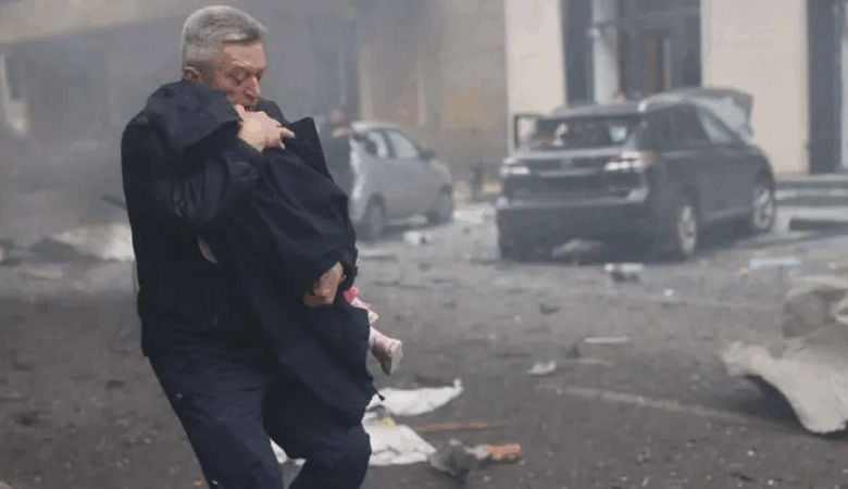 It is a striking image of a dramatic rescue from a nursery school in the eastern city of Kharkiv, following a devastating, direct hit by a Russian drone.