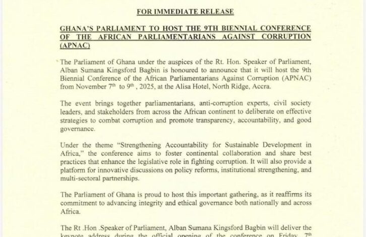The Parliament of Ghana, under the auspices of the Speaker of Parliament, Rt. Hon. Alban Sumana Kingsford Bagbin, has announced that it will host the 9th Biennial Conference of the African Parliamentarians Against Corruption (APNAC) from 6th to 9th November 2025 at the Alisa Hotel, North Ridge, Accra.