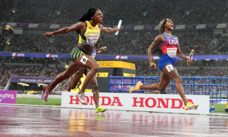 Sep 20, 2025; Tokyo, Japan; Sha’Carri Richardson (USA) defeats Jonielle Smith (JAM) on the anchor of the women’s 4 x 100m relay, 41.75 to 41.79, during the World Athletics Championships at National Stadium. Mandatory Credit: Kirby Lee-Imagn Images